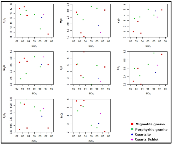 The major oxides analysed in the rock samples are SiO2, Al2O3, Fe2O3, MgO, CaO, Na2O, K2O, TiO2, P2O5, MnO and Cr2O3. The geochemical results (Table 2) shows the following ranges: SiO2 ( 67.37%-62.46%), Al2O3 ( 17.35%-11.62%), Fe2O3 (total) ( 6.44%-2.3%), MgO (3.18%-1.02%), CaO (5.04%- 0.72%), Na2O (4.1%-2.44), K2O( 6.95%-2.01%), TiO2 ( 0.96%-0.21%), P2O5 (10.02- 0.25%), MnO (0.17%- 0.07%) and Cr2O3 (<0.002- 0.012%). The result revealed that the rocks in the studied area are rich in silica, moderately rich in feldspars (Plagioclase, sodic and potassic), feldspathoids as well as being aluminosilicate in nature while other oxides such as CaO, Na2O P2O5 and TiO5 are present in minor to trace amounts in the rocks .Major oxides are regarded to as lithological index that reflects the geology of underlying rocks (Ojo, 1988).