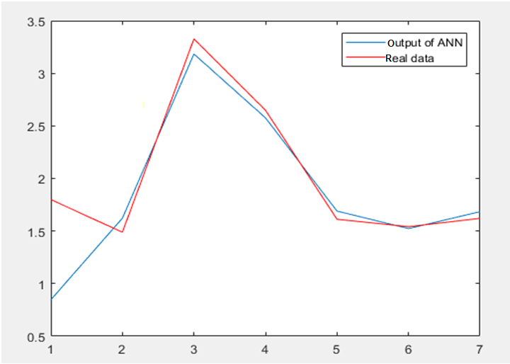 At this stage, the traffic of the 10th day is predicted using the basic neural network. 9-day traffic data is used for forecasting. At this step, 9-day traffic data are divided into two categories of training data and test data, then traffic data related to the 10th day are predicted based on train data. The time series diagram is then drawn separately for real observations and predicated results. Finally, the error values of the least squares for each hour are calculated. An example of a time series diagram for 3 A.M. is shown in Figure 3.