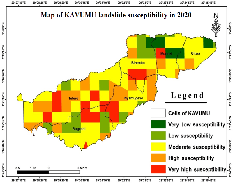 Situation of Kavumu Sector in 2020: It was noted that 13.6% of the area’s susceptible to landslides was very high, 20.0% of the area was high, 48.2% of the area was moderately susceptible to landslides, 18.2% of area was low and very low susceptible to landslide.