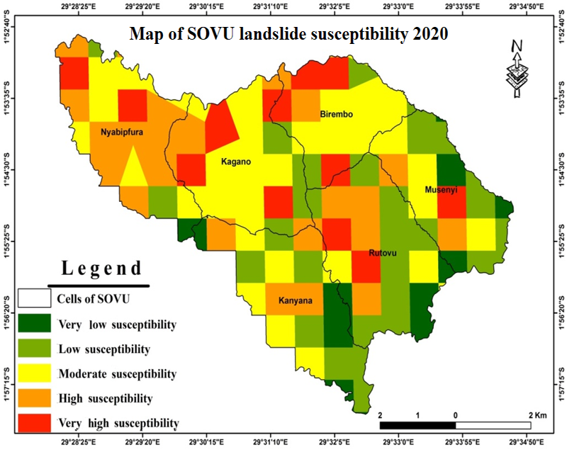 Figure 9. Landslide susceptibility in Kavumu, Muhanda and Sovu sectors 2020.