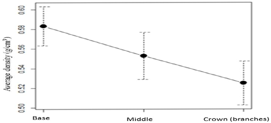 ANOVA test (p ˃0.05) showed that there was a variation in wood density at different levels of the tree. The wood density decreased considerably from the base to the branches. There was no significant difference between the base and middle of the trees as well as between the middle of the trees and the branches; however, there was a significant difference between the wood density of the base and the branches (Fig. 1). Table 1 shows the vertical variation in wood density of 30 species estimated at 105 ° C. There was a general pattern of decreasing wood density except few cases such as Petersianthus macrocarpus where the wood density at the base 0.567 g/cm³ increased to 0.594 g/cm³ and then decreased to 0.450 g/cm³ at the level of branches. There was a different pattern for Celtis adolfi-friderici where the wood density at the base 0.566 g/cm³ decreased to 0.496 g/cm³ and then increased to 0.508 g/cm³ at the branches level. The average difference between the densities considered at breast height and those at the branches level was 15%. This difference was 8% (min 1.5% and max 22.3%) between the average wood density of trees and the wood density only taken at breast height.