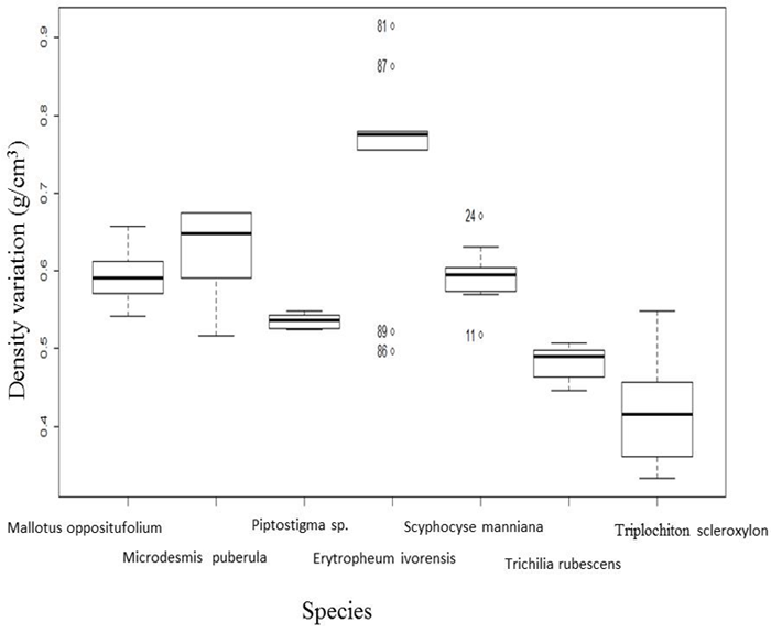 There was no significant variation between individuals of the same species. The following variations were observed Mallotus opposifolium (0.597 ± 0.029), Microdesmis puberula (0.633 ± 0.072), Piptostigma sp. (0.549 ± 0.034), Erythropheum ivorensis (0.708 ± 0.129), Scyphocyse manniana (0.576 ± 0.032), Trichilia rubescens (0.501 ± 0.113), Triplochiton scleroxylon (0.443 ± 0.062). At 5% level, there was a significant difference between the wood density of Triplochiton scleroxylon, Erythropheum ivorensis and Scyphocyse manniana. There was also a significant difference between the wood density of Trichilia rubescens and Piptostigma sp. However, there was no significant difference between the densities of Mallotus opposifolium and Microdesmis puberula (Fig. 2).