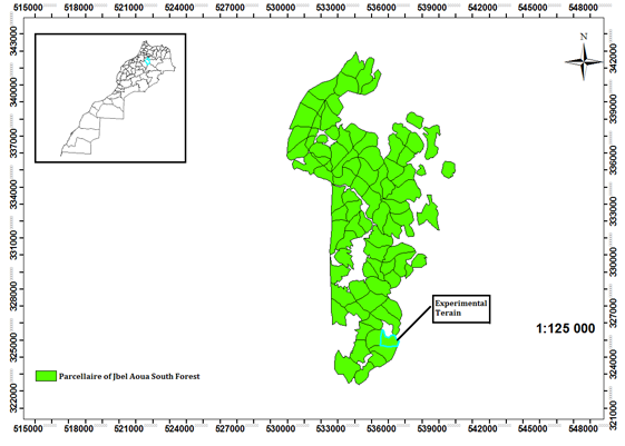 The study was conducted in plot 73 of the Jbel Aoua South forest (Figure 1). The geological structure of the area under study is very complicated with numerous repetitions of the middle Lias, limestone and dolomitic layers. Two types of soils are described in the region, namely red fersiallitic soils on limestone and dolomitic limestone and para-rendzine soil on sandy dolomite [9]. The average annual rainfall ranges from 537 mm to 1122 mm and the minimum temperatures from -4.9° C to -1.3°C, and the maximums range from 29.5°C to 32.5°C. The seasonal regime is Winter-Spring-Summer (H.P.A.E). With regard to snow, the studied area records 20 days of snow annually on average and 50 to 100 days of frost as an indication [6].