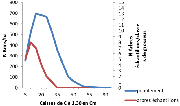 The statistical study (Figure 2) revealed that the structure of the sample trees is uni-modal and is homothetic to the stand structure.