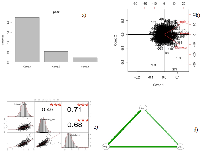 Figure-1. Factor loadings (a) for the P.patula cones with Length as Comp 1, Diameter as Comp 2 and Weight as Comp 3; (b) Biplot of the factor loadings of the cones with the measured values (Length, Diameter and Weight); (c) correlations of the measured values with values and p<0.05 significance (in Asterix) and (d) Network diagram of the same values based on correlation.