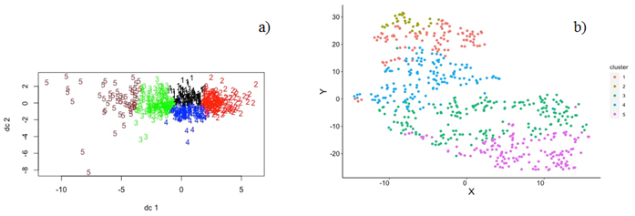 Figure-3. A centroid plot showing the optimum five (5) clusters and their distribution (a), Plot showing the clustering of the five clusters of P.patula cones (b).