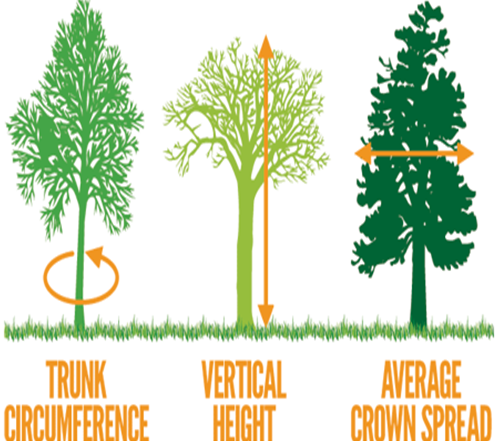 Estimating the total score of the champion trees first requires an inventory of the types of trees that are present on campus. The methodology developed by American Forests and used by Big Tree Programs across the nation is adopted. Before nominating a champion tree, three measurements are necessary: (1) tree height (measured in feet), (2) trunk circumference (measured in inches), and (3) average tree crown spread (measured in feet) (see Figure 1).