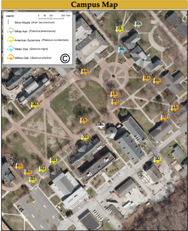 As shown in Table 1, the total score for each tree has unique weight based on their constituent measurement values. Some notable findings include: (1) Of over 27 tree species evaluated based on minimal size estimates, the list of top-20 champion trees consists of the same 5 tree species (Willow Oak, American Sycamore, Water Oak, White Ash, and one Silver Maple). (2) Though Tree #2 has the largest circumference measurement, Tree #1 is roughly 10 feet taller and has 10 feet larger of a crown spread. (3) The Silver Maple (Acer saccharinum), Tree #17, is the only one of its species on the UMES campus, and therefore the only one to make the list. Its circumference alone is what made this otherwise-small-tree a Champion.