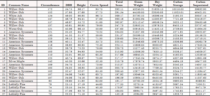 The value of trees has become increasingly more popular in today’s “green-conscious” society. When it comes to land planning, urban forestry, or even landscape design, trees are among the most critically needed aspects of consideration in order to be environmentally responsible for the future. Traditional, commercial forestry textbooks even elude to relating carbon sequestration values with tree worth. This study has the potential for relating its data to carbon sequestration values, where a carbon stock assessment could be made of selected champion trees on the UMES campus Table 3.