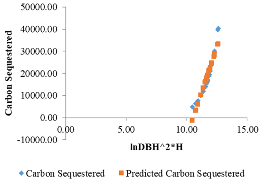 To estimate carbon sequestered per selected champion tree, allometric equation [7] is derived from the data as follows Figure 3: