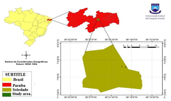 The study was carried out in a granite and gneiss mining area in the municipality of Soledade, in the state of Paraíba. This area is located under the coordinates 07º03’26 ”S and 36º 21’ 46 ”W, with an altitude of 521 meters [12] Figure 1.
