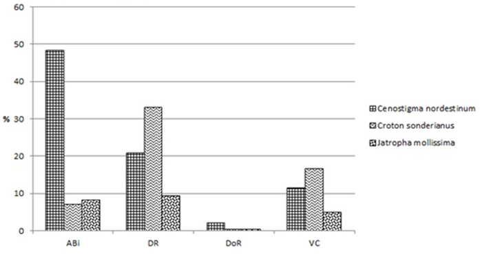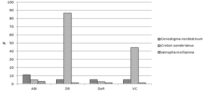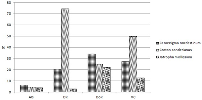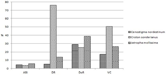 The values of Relative Density (DR) and Coverage Value (VC) for C. sonderianus were the highest in the area for 15 years, reaching 74.3 and 49.5% respectively. The relative dominance (DoR) of the species in this area was well balanced, varying between 33.9%, for C. nordestinum 24.8%, for C. sonderianus and 22.1% for J. mollissima Figure 10.