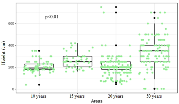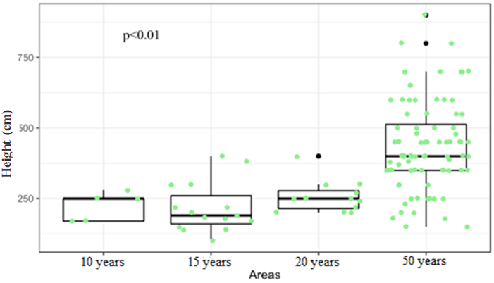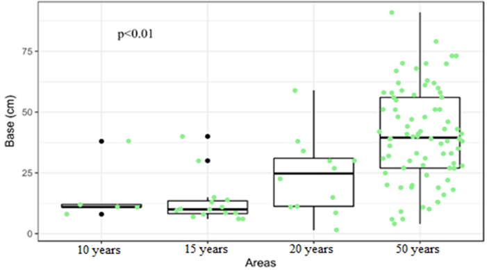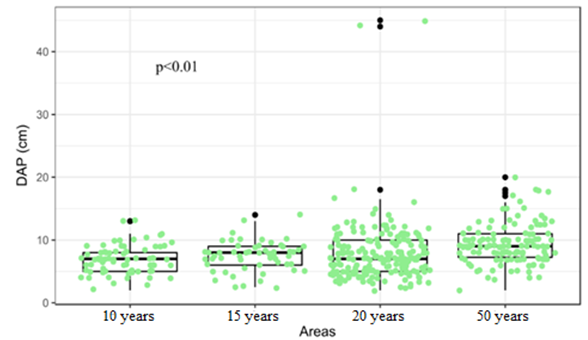 Figure 12 shows a similar effect for all parameters analyzed. Due to its size, C. nordestinum needs time to develop, mainly due to ecological succession. Newly devastated areas are expected to have grassy and herbaceous plant species. And, with the late levels of succession, even after their presence in the environment, species of shrub and arboreal size need time to develop until they obtain high DAP values, base diameter and height.