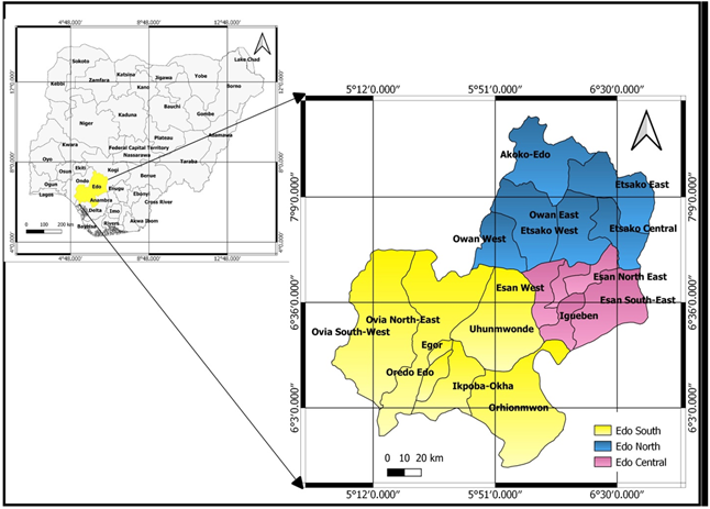 Edo state is one of the six States that constitute South-South Nigeria with Benin as the capital city. It has eighteen Local Government Areas (LGAs). It lies between latitudes 05° 441N and 07° 301N of the equator and Longitudes 06° 041E and 5° 451 of the Greenwich meridian (Figure 1). Edo State is made up of three senatorial districts (Edo Central, Edo South, and Edo North). Edo Central is made up of five LGAs (Iguiben, Esan Central, Esan West, Esan Nort East, and Esan south), Edo South comprises of seven LGAs (Orhionmwon, Ikpoba Okha, Egor, Uhunmwode, Ovia North East, Ovia South West, and Oredo) while Edo North is made up of six LGAs (Akoko Edo, Owan East, Owan West, Etsako East, Etsako Central and Etsako West);. The State has an annual rainfall of above 1,950mm, air temperature of 26.5oc, and relative humidity of above 78%. Figure 1 shows the map of Nigeria showing Edo State (the study area). The State occupies an area of about 19, 744 km2 with a population of over two million (2,159, 848). Tropical rainforests are categorized by a warm and wet climate with no substantial dry season.