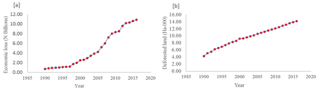 Figure-3(a). Economic loss associated with Deforestation in Edo State between 1990 and 2016. (b) Rate of Deforestation in Edo State between 1990 and 2016.