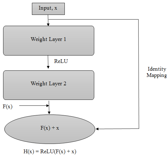 Here, x is the input, and F(x, {Wi}) is the residual block, and Wi is the number of layers in the residual block. A residual block is shown in Figure 4.