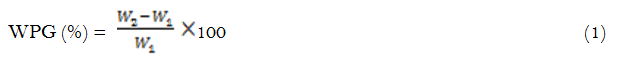After acetylation, weight percent gain (WPG) of the wood were determined on the oven dry basis. The wood blocks were weighed, oven-dried at 105±2 °C until a constant weight is reached. Ten (10) replicates of treated and untreated specimens were used to determine the WPG. The average weight percent gain (WPG) was calculated using Equation 1 for each batch.