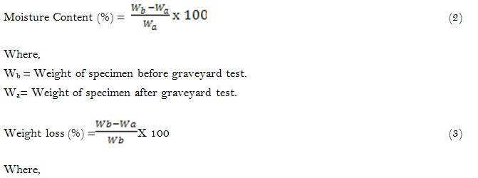 After three months of exposure to termite, the wood blocks were removed, conditioned and their moisture content and weight losses were determined using Equation 2 and 3.