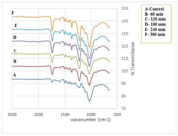 The stretch at carbonyl region at 1738-1730 cm−1 in all the acetylated samples indicates that some of the hydroxyl groups (-OH) in the wood has been changed with the acetyl groups. The intensity of these peaks increase due to increase in the reaction time (Blanco & Alfaro, 2014; Mohebby, 2008). The C-H stretch at 1370 cm−1 seen in the modified wood is due to deformation of methyl groups in cellulose and hemicellulose (Evans, Micehll, & Schmalzl, 1992). The C–O stretch region occurring at 1245-1000 cm−1 in acetylated samples is due to deformation of carbonyl in the ester bonds in lignin and xylan which also increases as the reaction time increases (Blanco & Alfaro, 2014; Mohebby, 2008). The stretch at this peak when compared to untreated samples confirms the esterification reactions between the acetic anhydride and the hydroxyl groups.