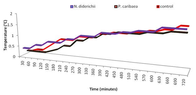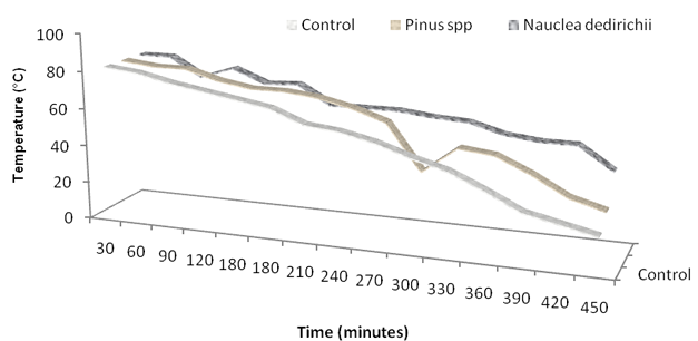 The result of hot water retention capacity of wooden ice chest coolers with that of control after 450 minutes was illustrated in Figure 6. It was observed that wooden ice chest cooler made from this study responded differently with time. The result shows that after 450 minutes of hot water exposure, the least temperature recorded was 18 °C for the control (plastic cooler without wooden stand) followed by 25 °C for P. caribeae ice chest cooler while the highest value recorded was 40 °C for N. diderichii ice chest cooler. The outcome of the result indicates that N. diderichii wood retained heat energy more than P. caribeae (Figure 6). This observation reveals that each wood species does react differently to hot water and this difference could be as a result of individual characteristics such as density, extractives and anatomical structures of each wood species. It was observed that ice chest coolers made from N. diderichii of higher density (650 kg/m3) had higher heat retention capacity than P. caribeae of density 450 kg/m3.