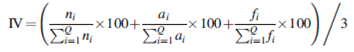 where ni is the number of individuals of the ith species, ai is the basal area at a height at DBH of the ith species, fi is the number of quadrats in which the ith species appeared and Q is the total number of quadrats.