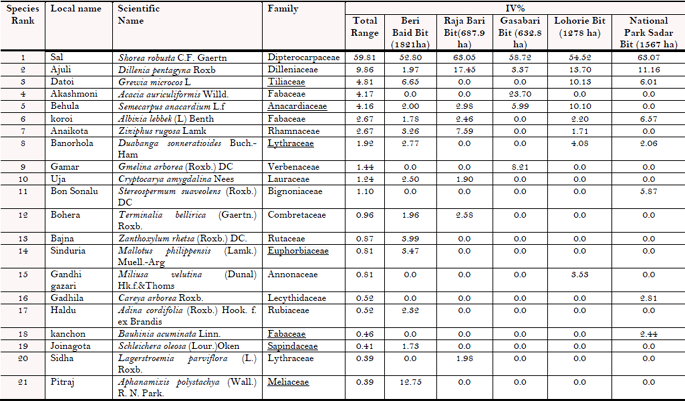 Table-1. List of twenty-one species in order of species rank determined by the importance value (IV%) in National Park range in Tangail North Forest Division.