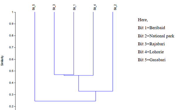 The floristic similarities among five bits were classified using the dendrogram of the Jaccard similarity index. (Figure 1). The highest similarity was found between Beribaid bit and Rajabari bit and the similarity index value was 0.48. The second and third highest similarities were between the Beribaid bit + Rajabari bit and the Lohore bit (index value=0.46); and between the Beribaid bit + Rajabari bit + the Lohore bit and the National Park bit (index value= 0.35), respectively. The lowest index value of 0.24 was found between the Gasabari bit and the combination of other four bits.