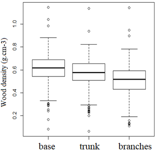 ANOVA test showed a high significant difference between wood densities of the base, trunk and branches; this was also the case for the comparison two by two according to Turkey’s test. For Henry, et al. [10] within the same species and the same tree, wood density vary (decrease) between different organs including roots, along the stem, the branches and leaves. Thus, as in several studies [8, 10, 12, 14, 15, 36, 37] the wood density variation increase vertically along the tree. Ecophysiological aspects relate to the tree species could be the origin of this variation [16].