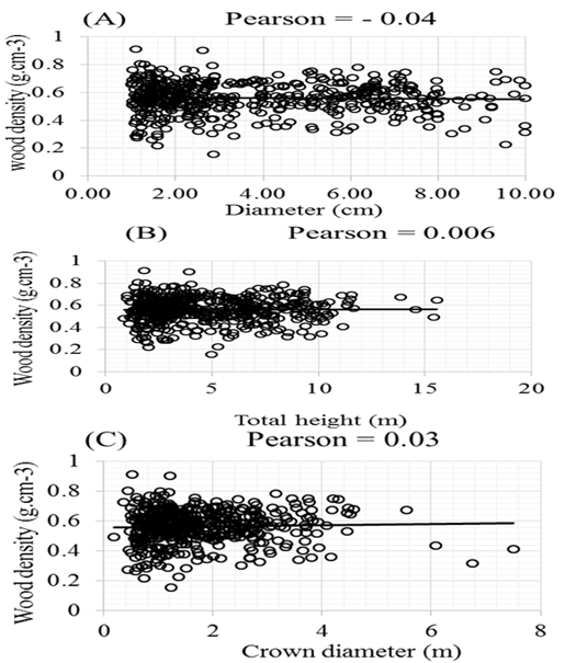 The arithmetic mean wood density of the trees showed no significant correlation with wood density and measurements variables of trees size (diameter, total height and crown diameter); in fact, Pearson's correlation coefficient showed that variation of measurements variables of tree size does not have any influence on the wood density. Thus, the correlation between diameter and wood density found was -0.04, that of total height and wood density was 0.006 and finally that of crown diameter and wood density was 0.03 Figure 2.