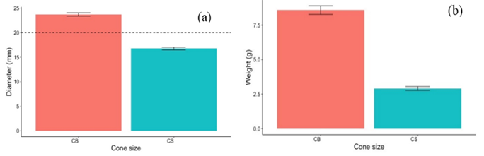 Figure-2(a). Mean cone diameters for large cones >20mm (CB-red) and small cones <20mm (CS-blue), 2 (b) Mean cone weights for large cones >20mm (CB-red), and small cones <20mm (CS-blue). Error bars show standard error, n=480 cones.