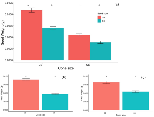 Figure-3(a). Seed weight by cone size from which seeds were derived (CBSB, CBSS, CSSB, and CSSS), (b) mean weight of seed by cone (CB and CS), and (c) mean weight of a seed by size (SB and SS), small letters (a, b, c, d; a and b) above denote significance (p<0.05).
