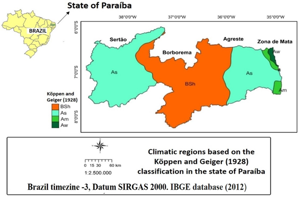 Figure-1. Location of the state of Paraíba, divided into three climatic regions, referring to the study Phytogeographic Analysis of Bromelia L (Bromeliaceae) state of Paraíba.