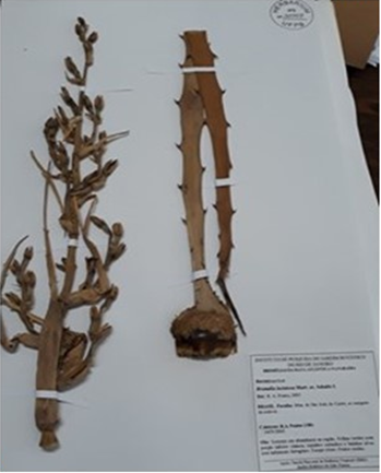We analyzed 58 dried specimens in the four visited herbaria. Of which 4 were depositedon 6 exsiccates EAN, Bromelia (Bromeliaceae), da B. laciniosa Mart. Ex Schult. f. No JPB were verified eight exsicates of B. laciniosa and four B. karatas L. (Figures 2, 3, 4 and 5). This species was recorded in two distinct climatic regions, located in the wetlands of Agreste and Litoral and in space, located in the Intermediate Regions of Campina Grande and in the Semi-Arid, in the Sertão (region of state Paraíba).