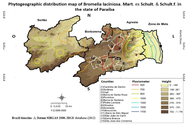 The preparation of the map took place in three phases: initially the layer of hypsometry was made; for the second layer, the isoíetas, from the points of equal pluviometric regimes, were specialized, through the database of the Executive Agency of Management of the Waters of the State of Paraíba AESA; and finally the third in the third layer, were specialized municipalities that responded to the phytogeography of the Bromelias studied. The shepefile, municipalities, is also part of the AESA database.