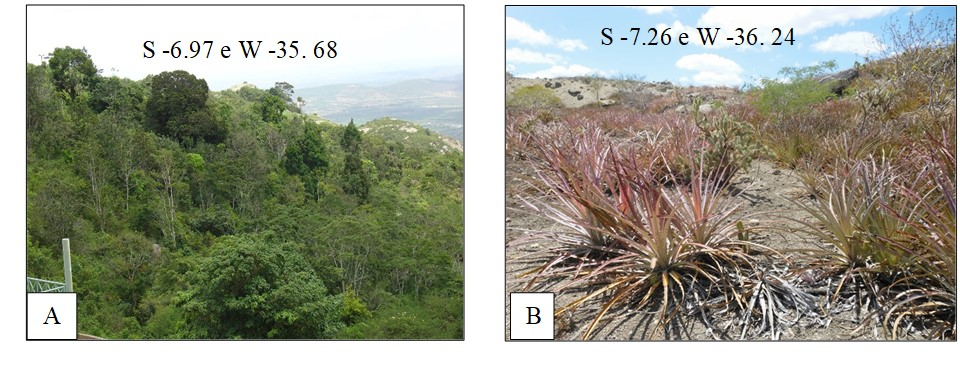 Figure-8. Landscape features, where the species occur: A - B. karatas L, wetlands, such as Subperenifolia Forest, or Submontana Rain Forest in Areia - PB. B - B. laciniosa Mart. Ex. Schult f. recorded in dry areas of seasonal deciduous forest or seasonal Caatinga as in Boa Vista-PB relating to study fitogeográfica Analysis Bromelia L. (Bromeliaceae).