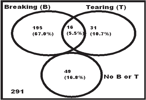 To assess the tunnels’ impacts of damaging beetles on the trees, data on numbers of trees experiencing branches breaking and/or tearing were recorded. The data were analysed using Venn diagram approach while some snapshots were used to demonstrate the dimensions of breaking and tearing.