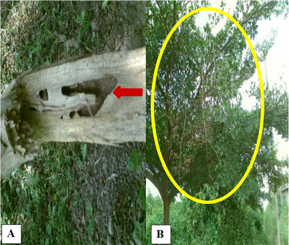 A. terebrans tunnels have breaking effect on T. mantaly branch wood (Figure 6) as breakings occurred around the previously attacked closed and opened tunnels entries. However, strong but not critical wind was identified as a contributory important factor for breaking of previously attacked closed tunnels (Figure 6A). A. terebrans is known to inflict their damage on trees mainly through tunnelling of wood along the grain [12, 16]. The dimensions of wood breaking (Figure 6) found in this study suggests the medium and short-term breaking impacts of A. terebrans attack. These breaking impacts were found causing asymmetric tree crowns. The revelation of closed cavities (Figure 6A) indicates that healing response of T. mantaly documented by Adedeji, et al. [16] was just a mere superficial closure. This implied that many trees seeing with beetle tunnel’s scars may have in-wood tree cavities. Cavity defects in wood are a determinant of mechanical strength loss causing tree failure and human death in urban environments [36-38].