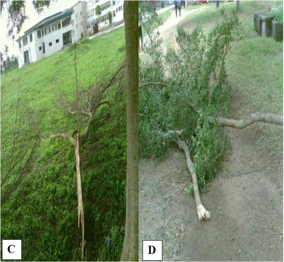 In all, majority (67.0%) of the trees experienced breaking, 5.5% experienced both breaking and tearing, 10.7% experienced only tearing of branches while 16.8% experienced no breaking or tearing (Figure 5). Two dimensions of branches wood breaking (A = complete, B = partial) were recognised (Figure 6). Also, two dimensions of branches tearing (C = crossing over, D = point) were recorded Figure 7.