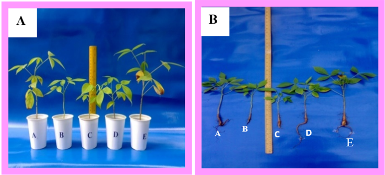 Figure 1. Graphical growth abstract of Bombax ceiba showing in different soils before (A) and after harvest (B). Symbol used: please see Table 1