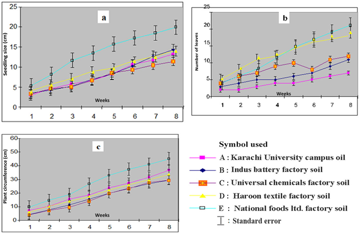 This experiment was carried out in the greenhouse of the Department of Botany, University of Karachi's Pakistan. The composite soil samples were taken from 30 cm depth from five location of A = Karachi University Campus; B = Indus Battery factory; C = Universal Chemicals Factory; D = Haroon Textile Factory and E = National Foods Limited for testing the seedling growth performances experiments.