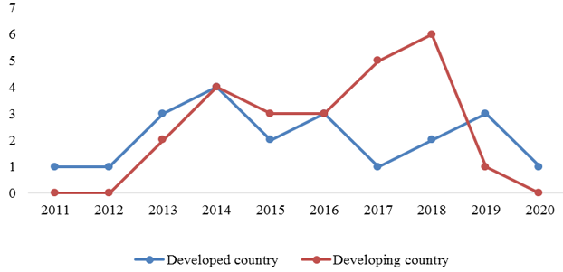 This study uses the systematic review method, TOE framework and DOI theory for exposition of factors influencing enterprises in countries that are developed and developing when they adopt cloud computing. The study for analysis was further applied to identify the literature-based deterrents of cloud computing. The TOE framework and DOI theory were chosen for two reasons. Firstly, TOE framework is a more complete explanation of the application of innovation in businesses [31]. Secondly, TOE is popular in cloud computing research. Specially, 27 out of 48 studies have used the theoretical models to analyze the factors affecting enterprises’ decision to apply cloud computing, out of which, 19 studies used the TOE framework. Twelve studies have used the single TOE framework and 7 studies used the TOE framework in combination with another research theory like DOI or Technology Acceptance Model (TAM). However, to fully explain the factors that affect enterprise application and innovation processes is difficult when using one theory [33]. Hence, this research decided to incorporate the TOE framework and the DOI theory. The systematic review is an evaluation method, synthesizing studies and focusing on specific content by providing strong, transparent, and coherent evidence to increase the generalizability and applicability of research findings [34, 35]. In the first step, this study identified relevant publications by searching the following keywords: “factors” and “affecting” and “adoption” and “cloud computing” and “firms” and “developed country” and “developing country”. The search process revealed that the majority of articles appeared in Google Scholar, Emerald Insight, Spring Link, Science Direct, IEEE Explore. 1098 articles were downloaded from this step. In the second step, available data filtering tools were used to reduce the number of articles that were not included in the study based on year of publication, language and type of article (publication during 2011-2020, English language, two type of articles include review and research articles). A total of 706 articles were remaining after this step. The third step, authors read titles and summaries of articles to remove unrelated articles, 326 articles were rejected in this step. In the next step, after fully reading the contents of the remaining 380 articles, 332 articles were rejected. Finally, 48 articles (2 reviews and 46 research articles), specific to factors in relation to the application of cloud computing in firms, were used for this study. They were extracted from the following databases Science Direct (21), Google Scholar (14), Emerald Insight (5), IEEE Explore (4), Spring Link (4). The publication by year in developed and developing country are illustrated in Figure 1.