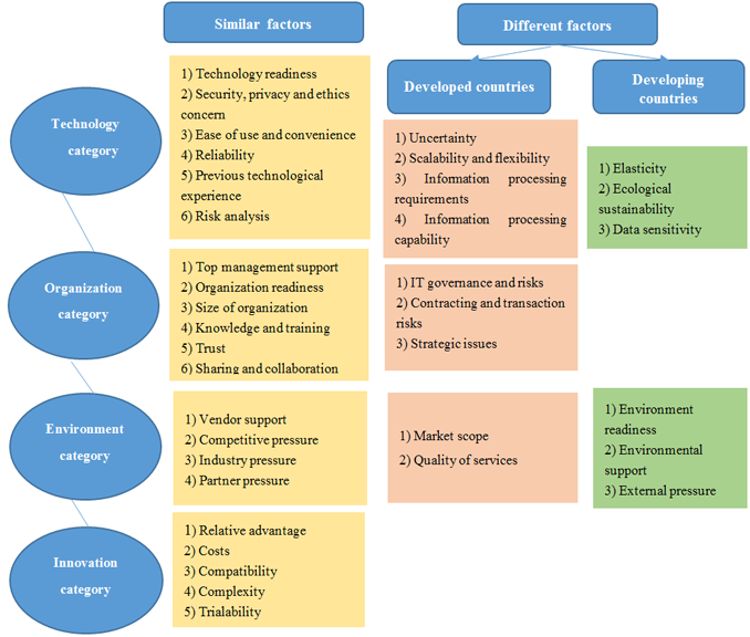 Figure 4 summarizes the different categories and factors that firms should consider when applying for cloud computing. A total of 36 factors affecting cloud computing in various organizations are mentioned, each stemming from a specific category. Developed and developing countries share 21 similar factors from the main categories including technology, organization, environment and innovation. However, in companies applying for cloud computing, the factors that influence the decision-making process differs significantly between countries with developed and developing economies. Developed countries focused on 9 factors from 3 categories, i.e., 4 from technology, 3 from organization and, 2 dealing with the environment. Factors from developing countries were based on technology and environment categories. For future research, expanding on these different factors to provide a deeper picture of factors influencing cloud computing adoption in companies is prerequisite.