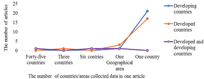 Most studies used one method of data collection. Out of 46 research studies, there were 33 studies using online questionnaires, 8 studies used semi-structured interviews and 2 studies used in-depth interviews, and only 1 study used mixed questionnaire surveys and in-depth interviews. A large number of studies used online questionnaires to collect data [41] while less studies were conducted through face-to-face semi-structured interviews [13, 38, 46]. Using only one method to collect data can lead to bias in research results.