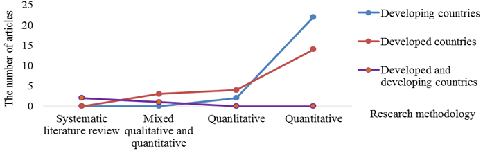 In Figure 6, quantitative method was the most popular research methodology used in 48 previous research, 36 of which were done in developed and developing countries, total 14 and 22, respectively. It is clear to see that studies in developed countries used many qualitative method and mix qualitative with quantitative method more than in developing countries. Four research studies used mixed method qualitative with quantitative (3 studies in developed countries and 1 study in all developed and developing country), 6 research studies used a qualitative method (4 studies in developed countries and 1 study in developing country). Some studies involving the factors that influence cloud adoption applied quantitative methods [3, 36, 41, 60, 64]. By applying a single research method, data collection is more efficient and less costly, however, this incurs several limitations. Research using qualitative methods often has a small sample size, so the use of such results to generalize the whole population is debatable [79]. In contrast, the quantitative method requires a larger number of samples and shows the general problem of the research object. However, this method does not entirely explain the meaning of the research problem [80].