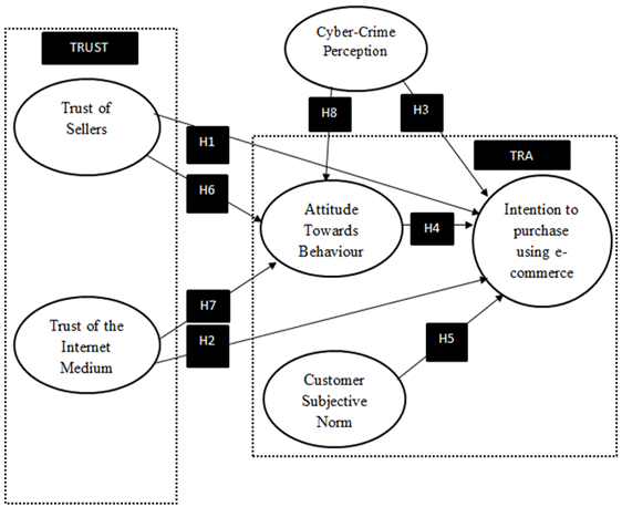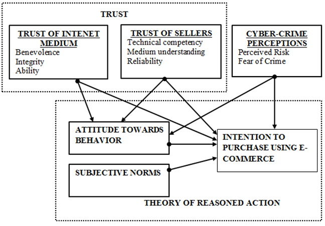 The conceptual model proposed in this study integrates cyber-crime perceptions, trust of the Internet medium and trust of sellers using the Theory of Reasoned Action [38].