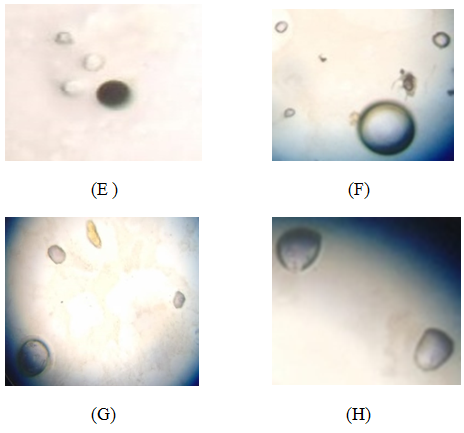 Figure-2. Microscopic images of silver nanoparticles found in the DPJ of various leaves (A) Irregular or triangular shaped nanoparticles from DPJ of cauliflower leaves (B) Irregular shaped NP from DPJ of cabbage leaves (C ) Traingular shaped AgNP from cabbage foliage DPJ (D ) Hexagonal or irregular shaped AgNP from foliage of radish DPJ. (E) Spherical shaped Silver Nanoparticles from the DPJ of Colocasia. (F) Spherical shaped NP in Colocasia DPJ (G and H) Spherical and irregular shaped NP in Colocasia DPJ.