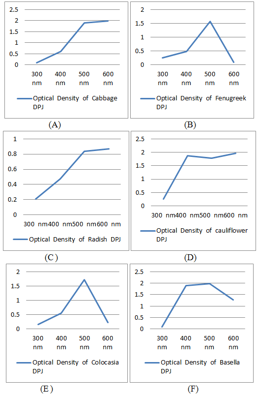 Figure-3.Calibration plot curves of the Silver surface plasma on resonance band (Optical Density) optimization of different DPJ made up of Foliages occurred at 300 to 600 nm wavelengths (A) Cabbage occurred at 600 nm, (B) Fenugreek on 500 nm, (C ) Radish on 600 nm, (D) Cauliflower on 600 nm, (E) Colocasia on 500 nm and (F) Basella on 500 nm.