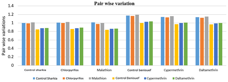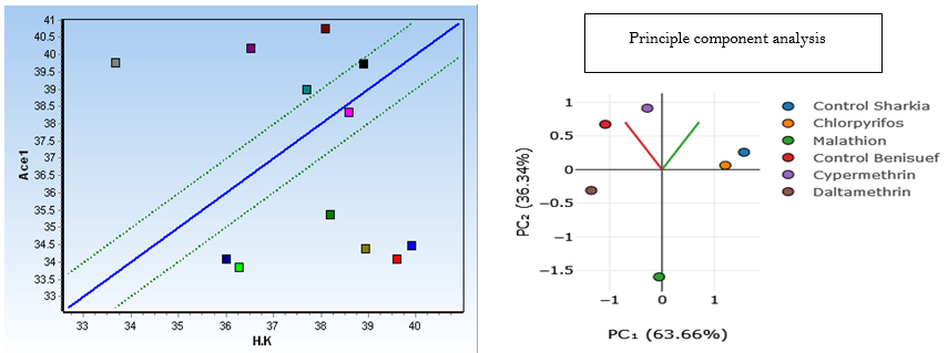 The Pink Bollworm Pectinophora gossypiella (Saunders) is a devastating pest in Egyptian cotton field. Insecticide control failure may be happen due to its biological features of hide inside bolls and rarely exposed to insecticide application. Thus, a bulk of bolls infested with larvae collected from fields of Sharkia and Benysuef governorate. Moreover, exposed to py, Op sub lethal concentrations in laboratory bioassay. Toxicity features as LC50, LC90 and the slope, and RR was completed. Whereas the common target site of OP and pyrethroid is the acetylcholinesterase enzyme. Thus, the gene Ace1 encoding AChE relative expression was investigated using molecular marker of real-time PCR procedures via the steps of generating data was RNA isolation and characterization, cDNA synthesis, then generating normalization factors, and Ct data attained and analyzed using 2-ΔΔCT method to quantify the gene expression quantitatively of insecticide treated larvae tissue extracted. Data showed the most expressed ratio of samples was cypermethrin followed by deltamethrin compared with the control and the least was malathion and chlorpyrifos, thus, the most effective insecticide was malathion and the least were cypermethrin according to ct values. Hierarchical clustering combined with Heat map and principle component analysis based on various clustering systems and algorithm as distance measures were completed. Validation of reference gene in addition to gene expression stability analyzed by the three optimal gene finders and showed that deltamethrin and cypermethrin treated genes having lower mean weights and considered transcriptionally stable and ideal reference genes.