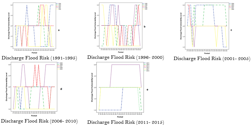 The 1990s discharge levels show dominance of low and moderate discharge with less consistency of higher discharge (Figures 8a and b) as high discharge were consistent for three and four pentads in 1992 and1999 respectively. The consistency of moderate and high discharge was intensified between 2000 and 2004; high discharge persisted between 46 – 59th pentads in 2003 and 42 – 52nd in 2004 (Figure 8c). The peak flood risk for 2005-2009 was characterized by variability across the pentads which will definitely minimize downstream flood (Figure 8d).