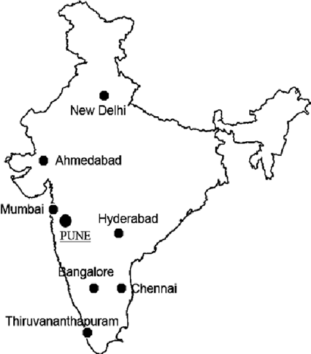 As mentioned above, the present study was conducted for the city of Pune, in Maharashtra, India. Pune is the second largest city of the state and usually is a recipient of moderate precipitation (214.85 mm as per the data acquired from India Meteorological Department, Pune) majorly occurring during the southwest monsoon season (June – September). It is located at approximately 18° 32’ North latitude and 73° 51’ East longitude. It lies on the Western margin of the Deccan plateau, at an altitude of 560 m above sea level. Figure 1 shows the location of Pune on the map of India.